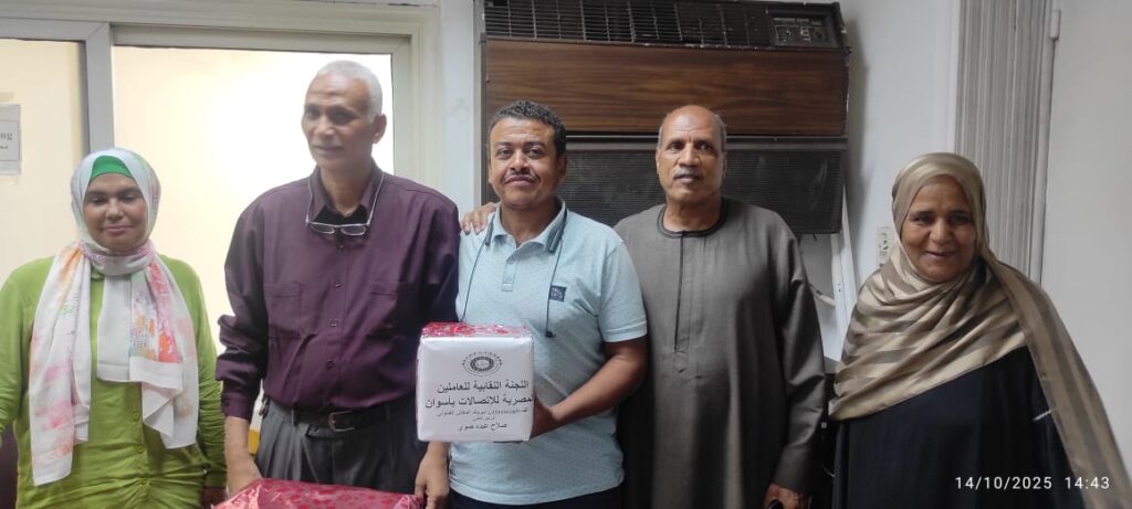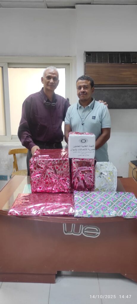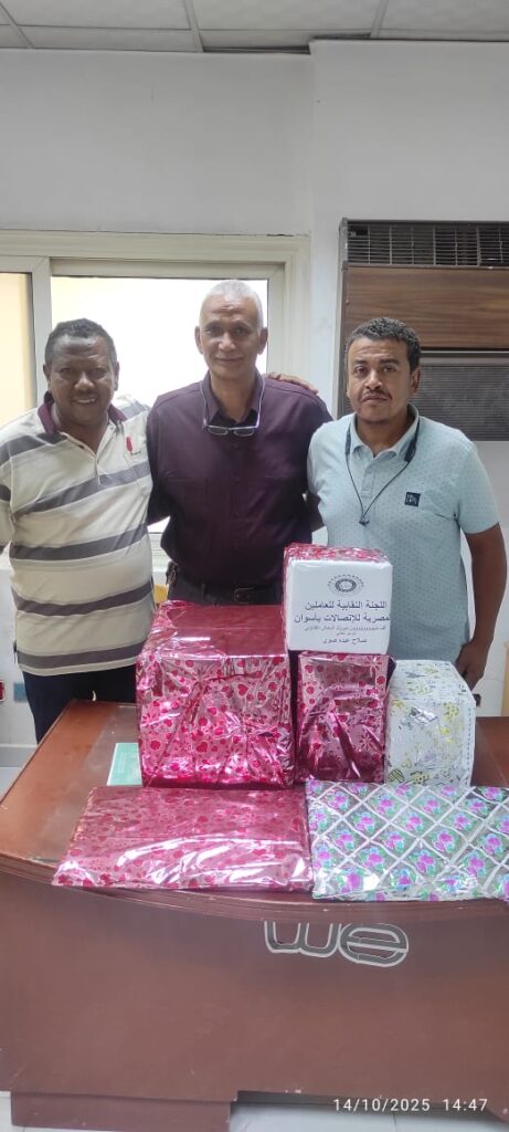 تتقدم اللجنة النقابية للعاملين بإتصالات أسوان برئاسة الأستاذ أسامة محمد بخالص التهاني والتبريكات للسيد الزميل النقابي صلاح عبده ضوي لحفل خروجة علي المعاش تحت رعاية المهندس محمد مصطفى مدير عام تليفونات اسوان وبحضور لفيف من السادة الزملاء وأعضاء اللجنة النقابية بأسوان ونتمني له دوام الصحة والعافية