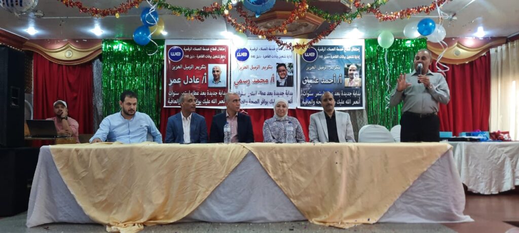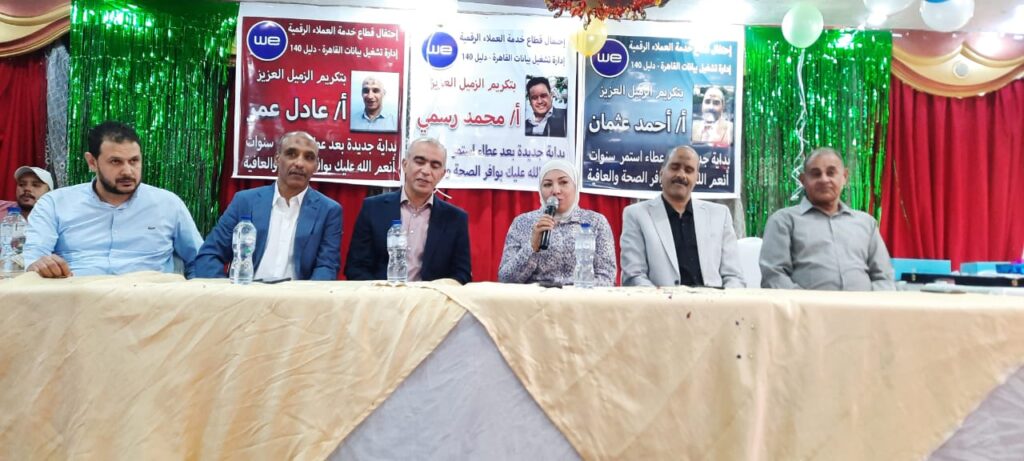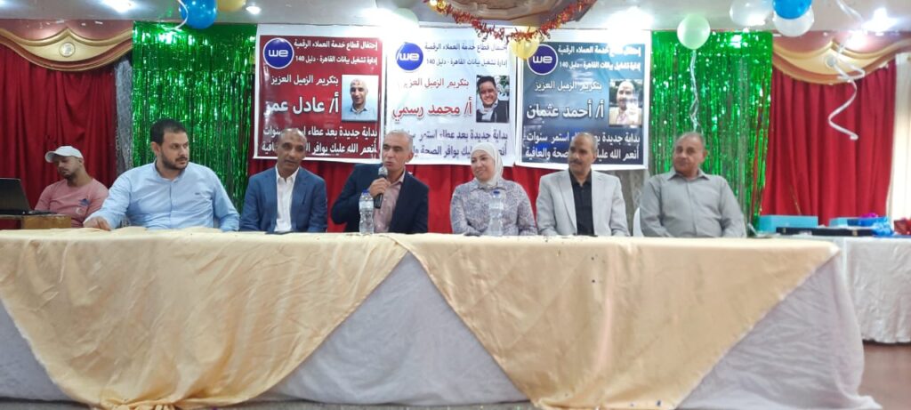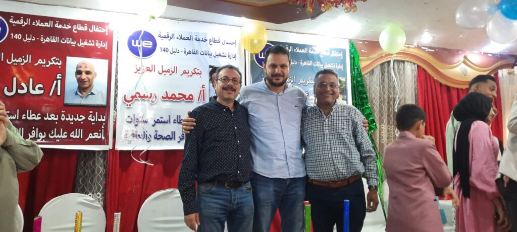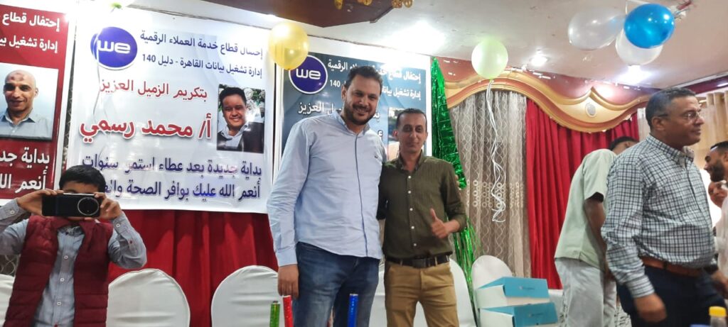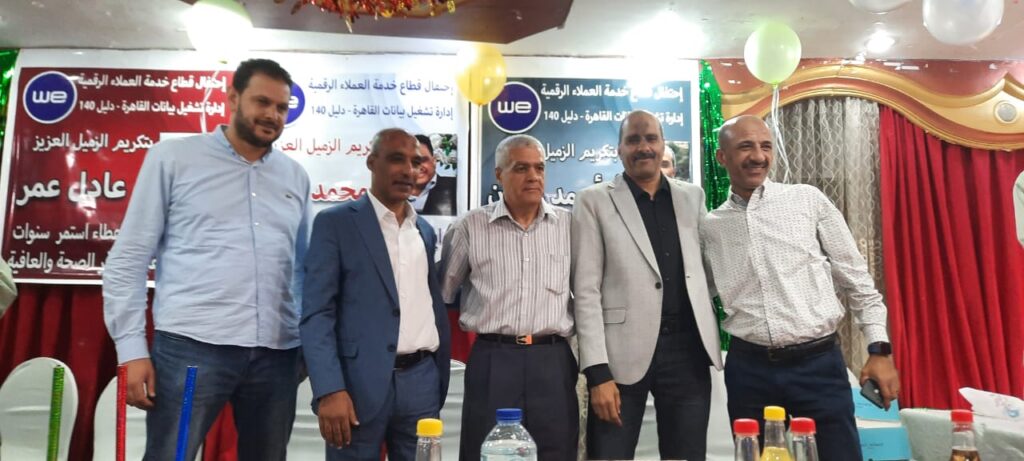 فى حفل عائلي بهيج يغمره مشاعر الحب والعرفان بالجميل تم الإحتفال بالزميلين الأستاذ أحمد عثمان والأستاذ عادل حسين بمناسبة بلوغهم سن المعاش القانونى وذلك برعاية المهندسة شيرين ابوالدهب مدير إدارة البيانات وبحضور السيد ايمن عبدالمنعم مدير عام تشغيل مراكز الاتصال “القيمة المضافة” والسيد رضا عبدالله نائب أول رئيس النقابة العامة للإتصالات والسيد محمد الصاوى رئيس اللجنة النقابية لدليل القاهرة والسادة أعضاء اللجنة النقابية ولفيف من الزملاء والزميلات. والقى الحضور الكريم كلمات الشكر والتقدير والعرفان لمسيرتهم الحافلة بالجهد والعطاء مع تمنياتنا لهم بدوام الصحة والعافية .